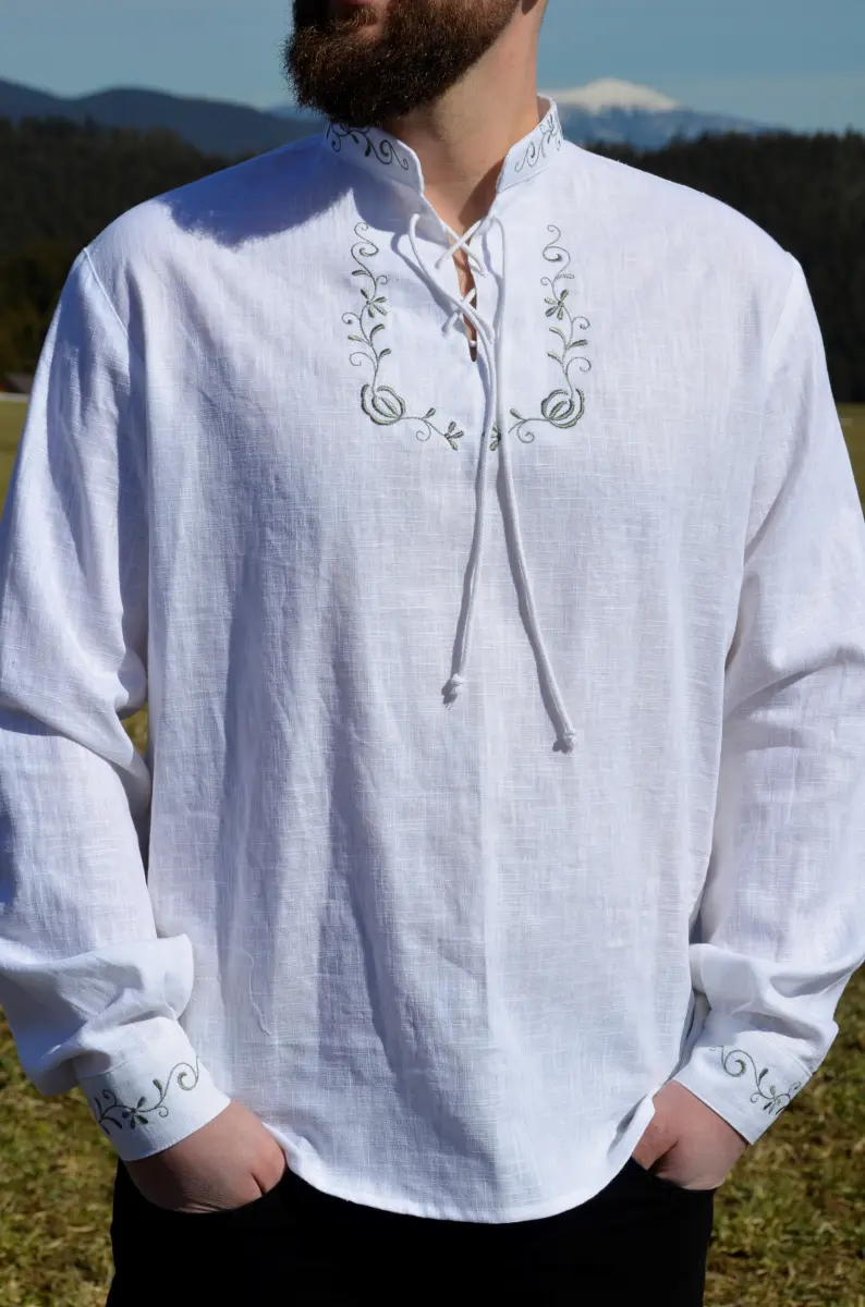 Elegantná košeľa s dlhým rukávom, ktorá spája sviatočný šarm s pohodlím na bežné nosenie. Jemná zelená výšivka na prednom diele a manžetách dodáva tradičný folklórny nádych, zatiaľ čo ľanový materiál ponúka prirodzené termoregulačné vlastnosti – v lete vás ochladí, v zime zahreje. Voľný strih a zapínanie na šnúrku zaisťujú maximálny komfort a jedinečný štýl.
