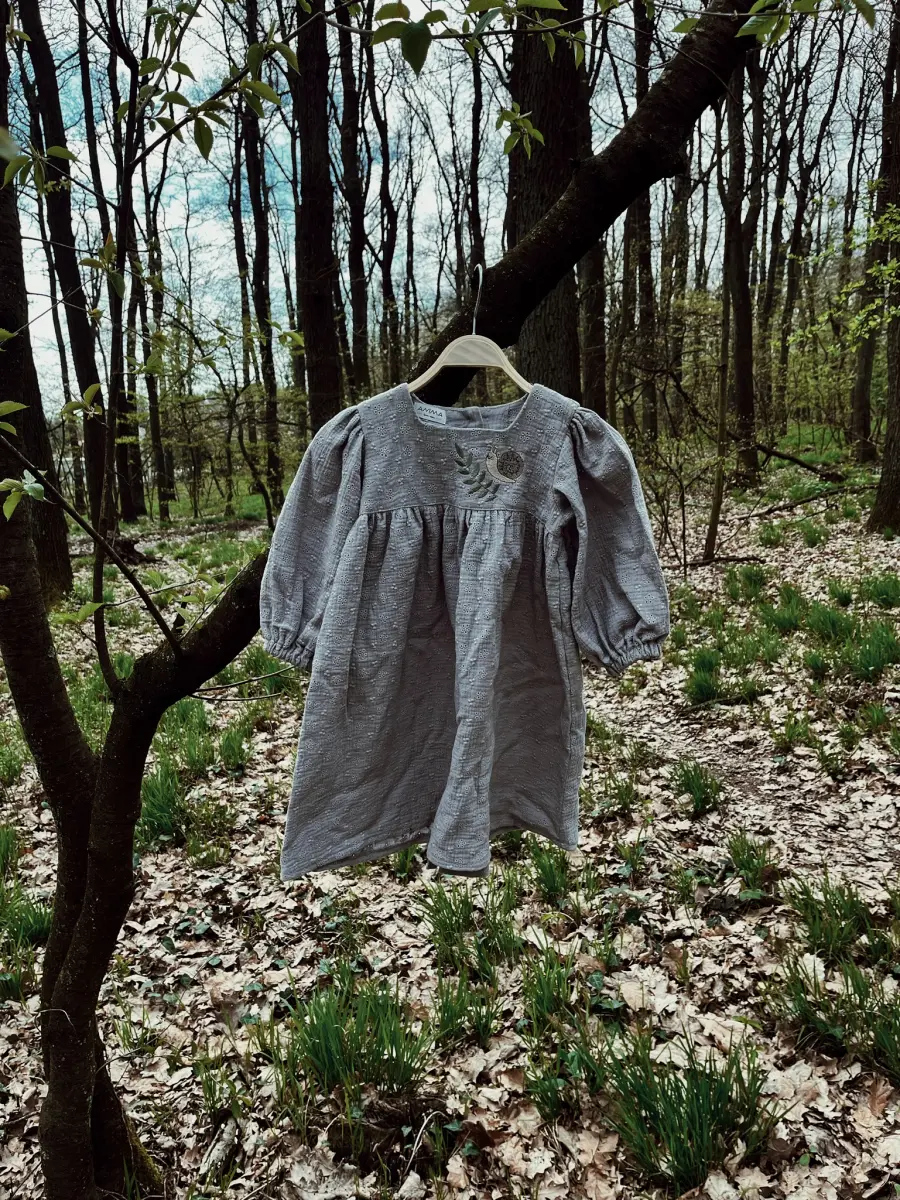 Tieto krásne dievčenské šaty v jemnej šedej farbe pristanú každej malej slečne. Sú ľahučké, vzdušné a vďaka príjemnému mušelínu poskytujú maximálne pohodlie počas hry aj oddychu. Predný diel zdobí nežná výšivka slimáčika, ktorý symbolizuje pokoj a hravé objavovanie sveta. Nariasené dlhé rukávy zakončené jemnou gumičkou pridávajú šatám šarm a zároveň sú praktické. Vzadu sa šaty zapínajú na gombíky, vďaka čomu sa ľahko obliekajú.