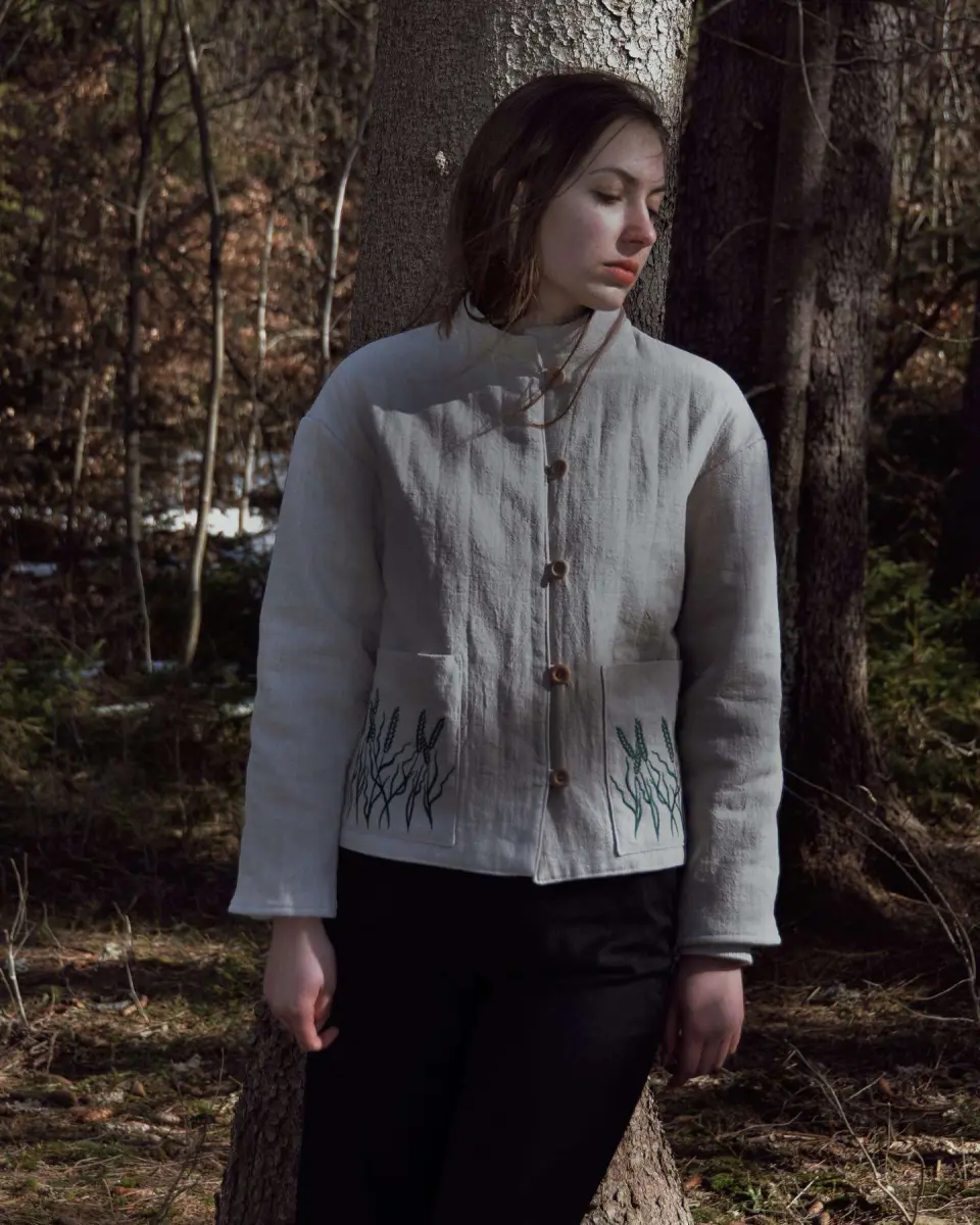 Tento prešívaný ľanový kabátik s vatelínovou výplňou je dokonalým spojením pohodlia a elegancie. Výšivka na vreckách, jemný mušelín ako podšívka a ručne prešívaný dizajn mu dodávajú jedinečný šarm. Kabátik je tenší, ale hrejivý – ideálny na jarné a jesenné prechádzky lesom aj na mestské potulky.