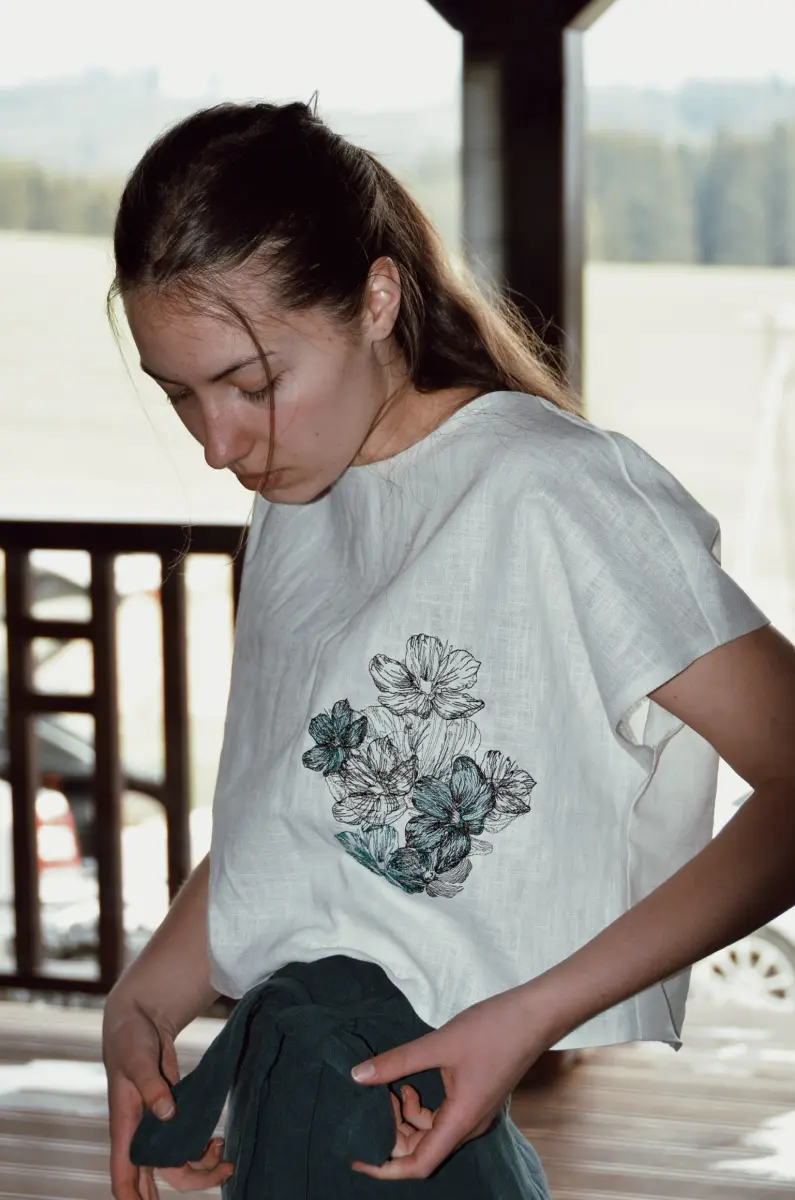 Tento ľahúčky ľanový top je ako stvorený na prvé teplé dni. Svojou jednoduchosťou a nežnou výšivkou dokonale doplní vašu jarnú či letnú garderóbu. Skvelo sa kombinuje s našou petrolejovou zavinovacou sukňou Lúčne kvety a vytvorí nezameniteľný romantický outfit.