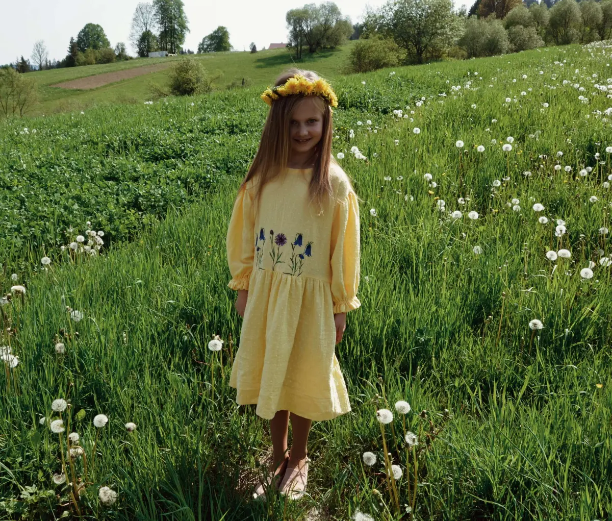 Žlté letné mušelínové šaty s výšivkou lúky – ľahkosť a hravosť v jednom