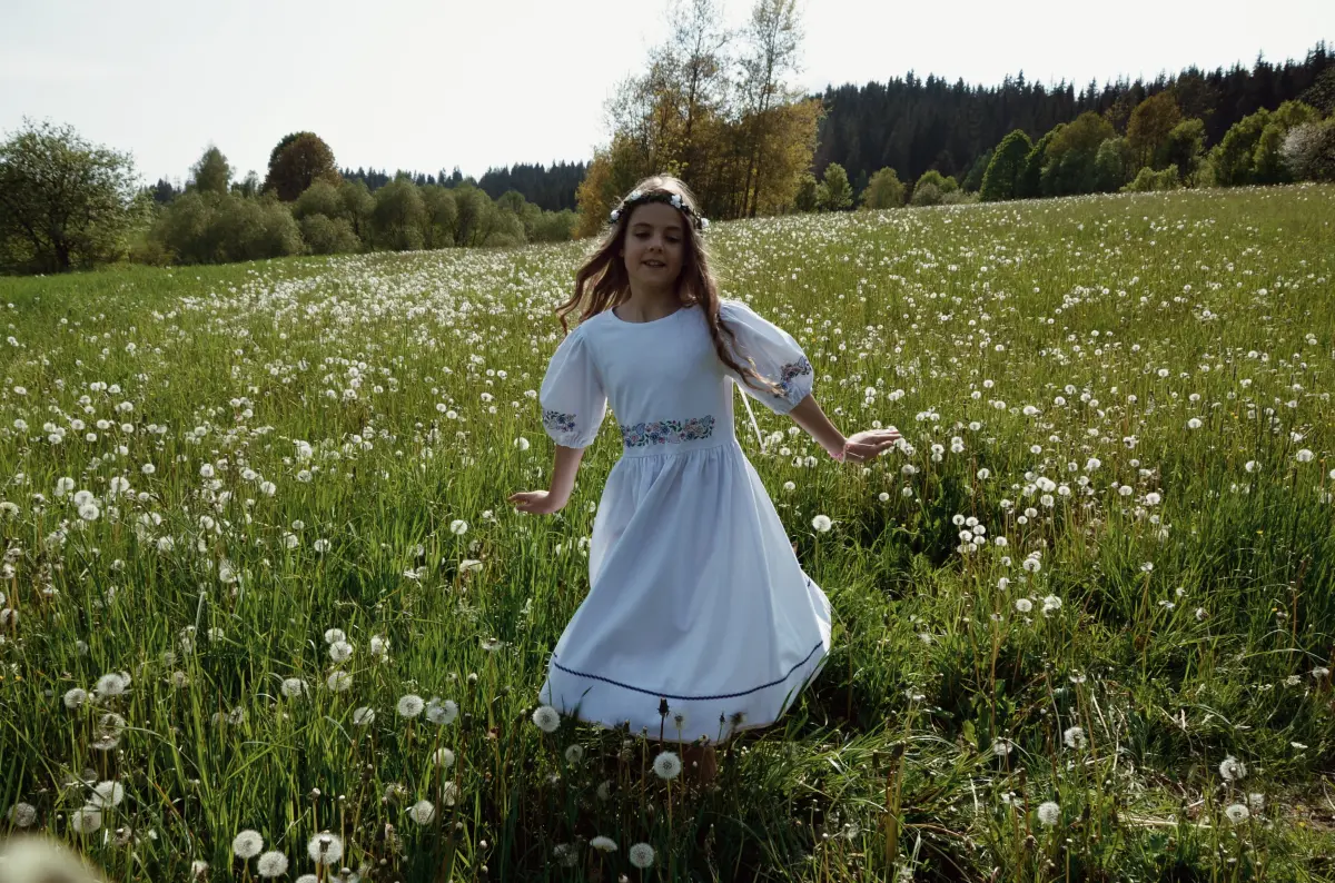Sloboda detí na kopcoch je radosť sledovať. A nech sa tieto biele šaty pokojne zafarbia od hliny a púpavového mlieka – vtedy vieme, že detstvo je plné smiechu, pohybu a radosti. Šaty majú voľný strih, ktorý deťom umožní tancovať, krútiť sa a objavovať svet bez obmedzení. Jemná výšivka na páse a rukávoch dodáva šatám jedinečný šarm a pripomína krásu rozkvitnutej lúky.