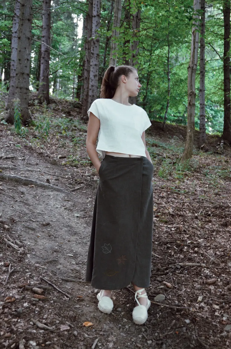 Táto zavinovacia ľanová sukňa Lesná melódia spája jednoduchosť, eleganciu a krásu prírody. Jej hlboký zelený odtieň pripomína lesné chodníčky, zatiaľ čo jemná výšivka lístkov na spodnom leme dodáva sukni jedinečný prírodný charakter. Vďaka pohodlnému strihu a zavinovaciemu dizajnu sa sukňa ľahko prispôsobí postave a zaručí voľnosť pohybu. Navyše, praktické vrecká v bočnom šve vám poskytnú miesto na drobnosti, ktoré potrebujete mať vždy po ruke. Perfektná na prechádzky v prírode aj mestské dobrodružstvá.