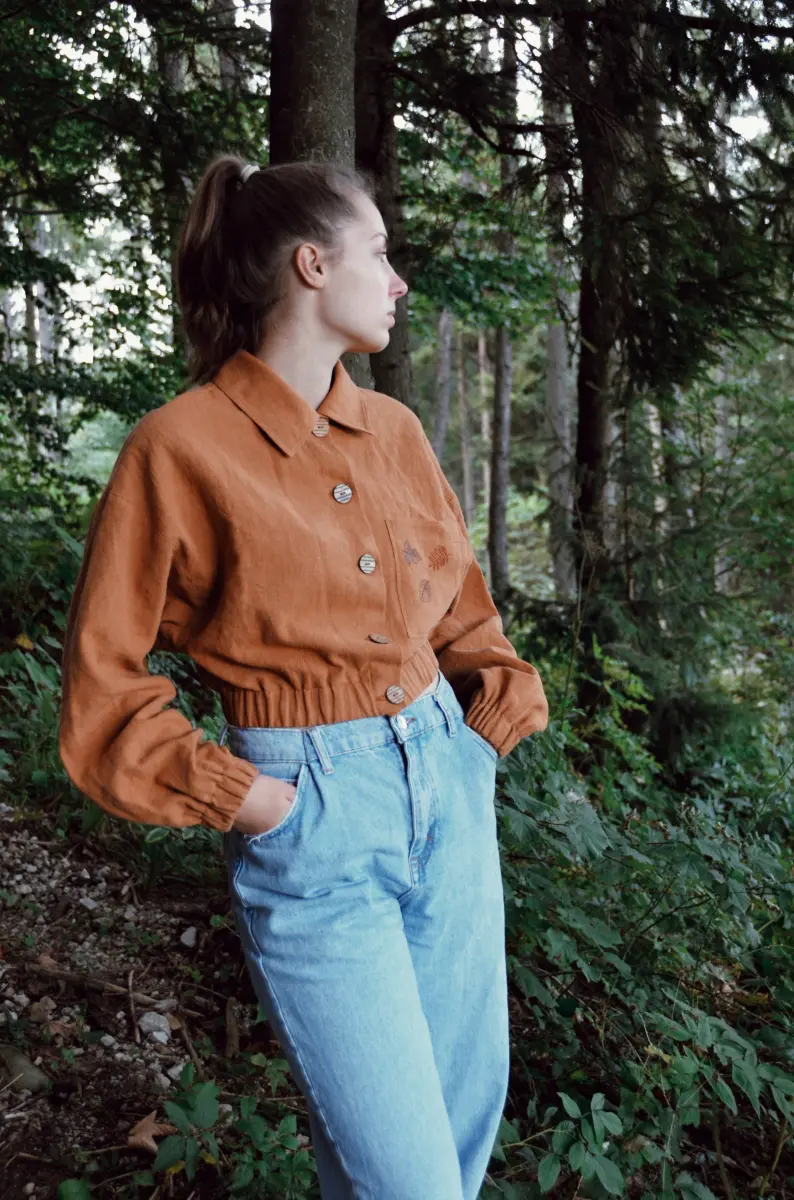 Tento čarovný krátky kabátik je vyrobený z mäkkého ľanu v tehlovej farbe, ktorý vás zahalí do tepla a pohodlia. Jemné detaily, ako vrecko s výšivkou listov, golier a kokosové gombíky, dodávajú kabátiku výnimočný vzhľad.