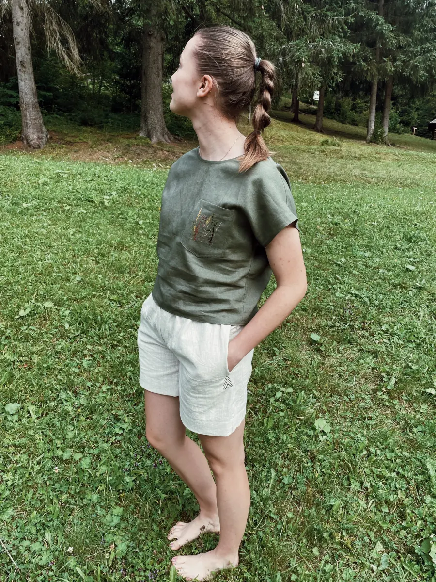 Výšivka na vrecku – jemný detail, ktorý topu pridáva osobitý charakter.