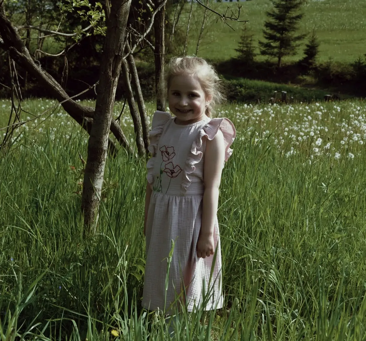 Tieto nežné dievčenské šaty zo 100% bavlneného mušelínu sú ako stvorené na hravé detstvo. Ich vzdušný materiál zaručí pohodlie pri každom pohybe, či už pri hre alebo oddychu. Výšivka na prednom diele a jemné volániky dodávajú šatám rozprávkový nádych.