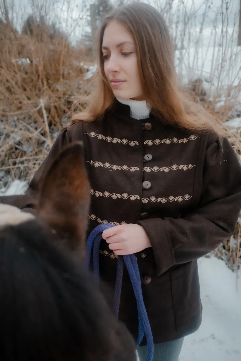 - Netradičný vyšívaný vzor – jedinečný detail, ktorý dodáva kabátu originalitu